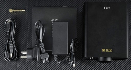 Wzmacniacz FiiO K7, kabel zasilający, zasilacz, kabel USB-B/USB-C, adapter słuchawkowy 3,5 mm/6,5 mm i dokumentacja.