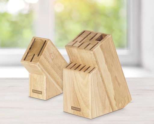Blok do noży Tescoma posiada 14 różnych otworów, które pozwalają na bezpieczne przechowywanie noży o różnych ostrzach, bożyc i ostrzałki. W otworach bloku możesz umieścić noże gładkie i ząbkowane, uniwersalne, szefa kuchni, do krojenia chleba, do siekania ziół, japońskie i inne.