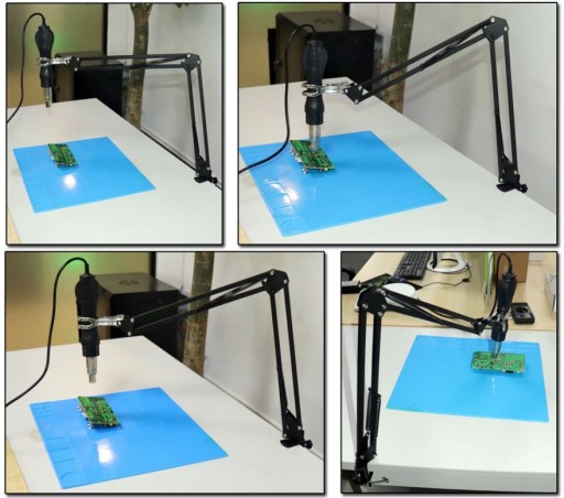 Uniwersalny uchwyt na kolbę gorącego powietrza HOT-AIR przeznaczony pozwala chwycić kolby o maksymalnej średnicy do 65mm. Uchwyt montujemy do krawędzi blatu stołu przy pomocy zacisku typu G czyli małego imadełka. Kolbę mocujemy przy pomocy uchwytu sprężynującego w pozycji pionowej. Dzięki wykorzystaniu oferowanego statywowy dla kolby HOT-AIR możemy nakierować strumień gorącego powietrza na lutowaną płytkę drukowaną PCB przy tym mając obie wolne dłonie, którymi możemy wykonywać inne czynności serwisowe.