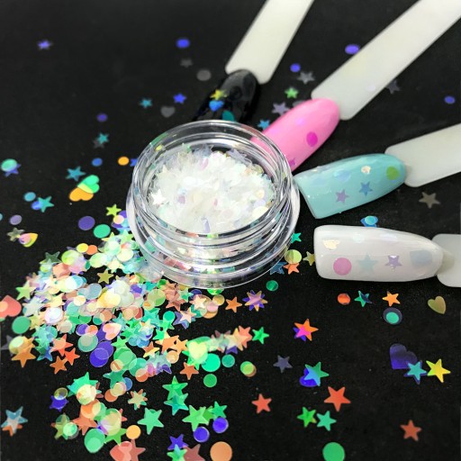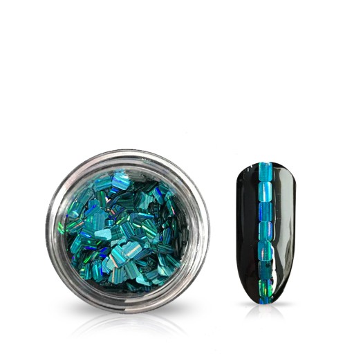 Holograficzna, mieniąca się ozdoba do stylizacji paznokci. Możliwość ułożenia wzorku lub wyłożenia całego paznokcia. Ozdoba nadaje się zarówno do lakierów hybrydowych, zatapiania w żelu czy do tradycyjnych lakierów do paznokci. Pięknie mieni się w świetle dziennym i sztucznym.
