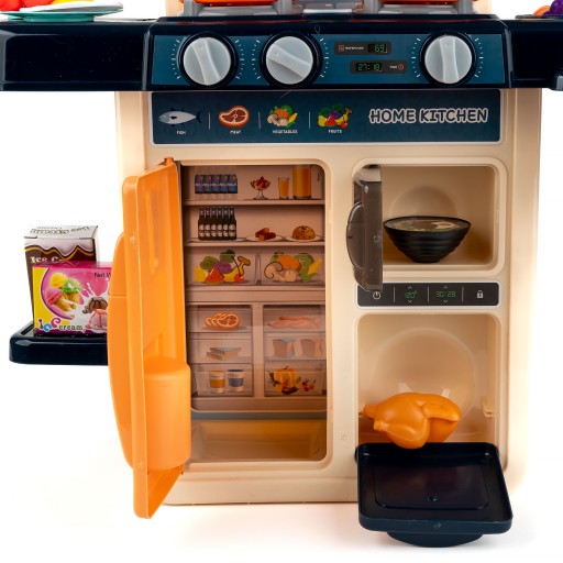 Na dole znajdują się pokrętła palników od planików które przeskakują w trakcie przekręcania, palniki imitują także odgłosy gotowania i dźwięk gotującej się wody. Jest też pokrętło od kostkarki do lodu, po jego przekręceniu usłyszymy dźwięk wypadających kostek lodu.