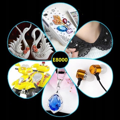 Klej E-8000 jest szeroko stosowany w: PP / PE / PS / PO / PVC / ABS / gumie, plastiku, skórze, gąbce, drewnie, papierze, zabawkach, szkle, ceramice, metalu, biżuterii z kryształami, oświetleniu, tkaninach, wyrobach rzemieślniczych, słuchawkach.