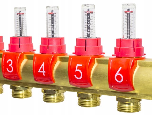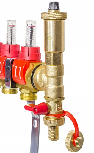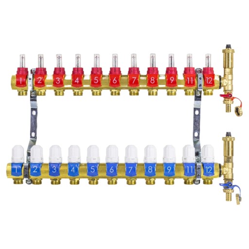 Komplet rozdzielacza z mosiądzu do ogrzewania podłogowego w budynkach. Wyposażony w : łączniki instalacyjne, zawory odpowietrzające, kurki kulowe spustowe, zawory termostatyczne bez głowicy rotametry 0,5 -5l/min, uchwyt montażowy. Belka dolna wyposażona we wkładki termostatyczne M30x1,5