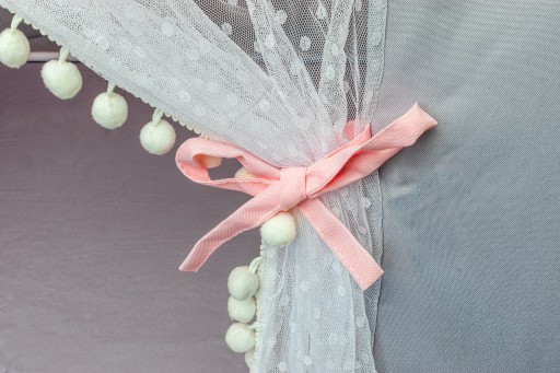 Firanki można przewiązać bądź udrapować przy pomocy ozdobnych tasiemek.