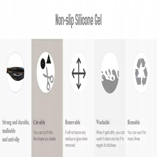 Antypoślizgowa lepka podkładka żelowa wykonana jest z mocnego, trwałego i plastycznego żelu silikonowego, zdejmowalnego, nadającego się do prania i wielokrotnego użytku, ponieważ można go używać wiele razy i nie pozostawia żadnych pozostałości ani kleju po usunięciu