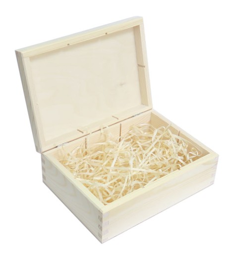 Pudełko jest wypełnione wełna drzewną - która pozwoli zabezpieczyć w środku prezent.