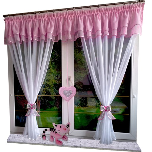 firaneczka z lambrekinem i serduszkiem na jednej taśmie marszczącej - z białego i różowego woalu.