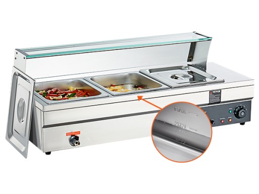 Solidna konstrukcja ze stali nierdzewnej: Ten podgrzewacz do żywności jest zbudowany tak, aby przetrwać, dzięki solidnej konstrukcji ze stali nierdzewnej, która wytrzymuje ciągłe użytkowanie i jest łatwa do czyszczenia i konserwacji. Taca ma pogrubioną ściankę (o grubości 0,76 mm), która zapewnia dodatkową wytrzymałość i pewny chwyt.