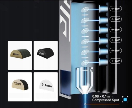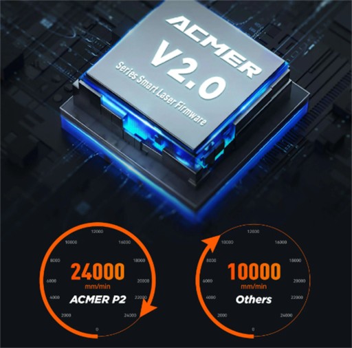 Technologia z technologią sprzężenia laserowego 6W, grawer laserowy ACMER P2 ma rzeczywistą moc optyczną 33W. Charakteryzuje się również bardzo precyzyjną ogniskową lasera wydającą 0,08 mm, minimalną przyczyną grawerowania 0,01 mm i szybkością grawerowania dochodzącą do 24000 mm/min. Poza tym może jednocześnie ciąć deskę drewnianą o grubości 30 mm, akryl o grubości 20 mm, a nawet nagrywać ze stali grubości o 0,1 mm.