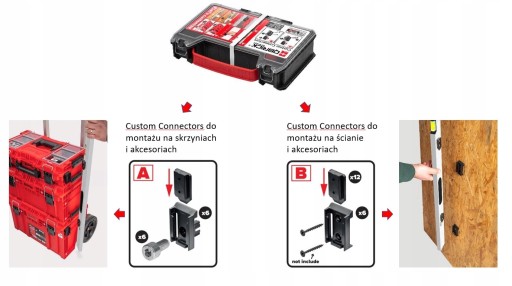 - Qbrick System Custom Connectors Set 1 posiada dodatkową funkcję odwieszania narzędzi na ścianie warsztatu lub samochodu.