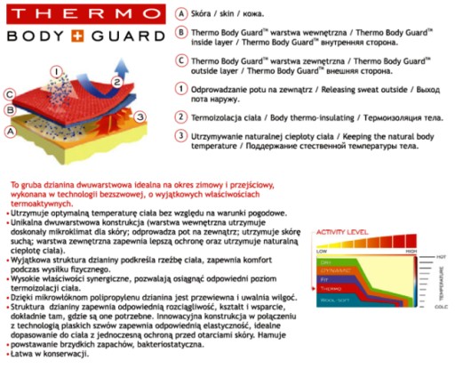 Niespotykane właściwości THERMO zawdzięcza w dużym stopniu najwyższej jakości przędzy funkcyjnej – NILIT INNERGY, z naturalnie występującym dodatkiem mineralnym, który zmienia naturalną energię cieplną ludzkiego ciała w głębokie promienie podczerwone i oddaje je do skóry, dzięki czemu powstaje uczucie głębokiego, delikatnego ciepła. Włókna tej przędzy posiadają naturalne właściwości termoizolacyjne – dodatkowo pobudzają ciało, poprawiają elastyczność mięśni, wspierają regenerację mięśni po intensywnym wysiłku. Uczucie delikatnego ciepła jest stałe, produkty THERMO utrzymują je nawet w niskich temperaturach. Ponadto posiadają właściwości antybakteryjne, które dają uczucie odświeżenia i doskonałego komfortu użytkowania. Budowa dzianiny, zróżnicowane strefy RIB utrzymujące produkt w odpowiedniej pozycji i ich faktura podkreśla rzeźbę ciała, a elastyczny i dopasowany materiał zapewnia pełną swobodę ruchów. Dodatkowo odzież posiada właściwości antyalergiczne i antybakteryjne.