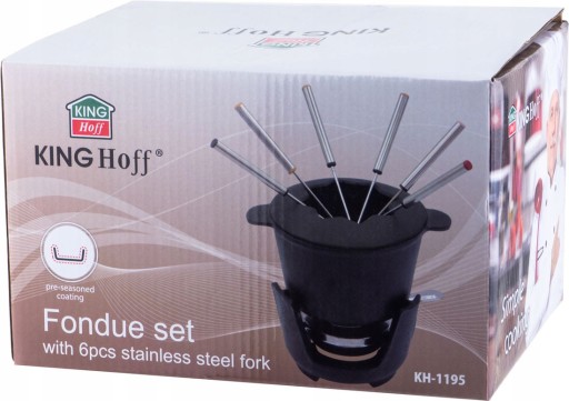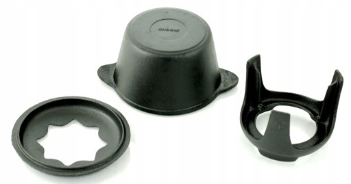 Skład zestawu: żeliwny stojak, żeliwny kociołek z pokrywką, palnik z pokrywką, widelczyki - 6 szt.