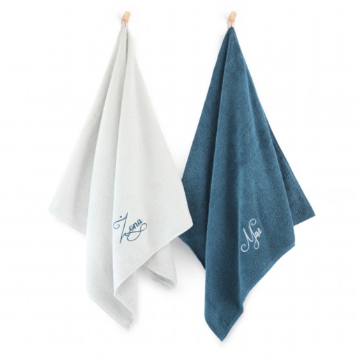 Dwuczęściowy komplet ekskluzywnych bawełnianych ręczników idealny na prezent ślubny, walentynkowy lub jako oryginalny upominek dla ukochanej osoby. Dwa duże ręczniki (70x130) w efektownej kompozycji kolorystycznej zdobione są dekoracyjnym haftem z napisem „Mąż” i „Żona”. Ten doskonały jakościowo zestaw charakteryzuje się aksamitną miękkością i trwałością kolorów. Dzięki niemu łazienka nabierze spersonalizowanego charakteru.