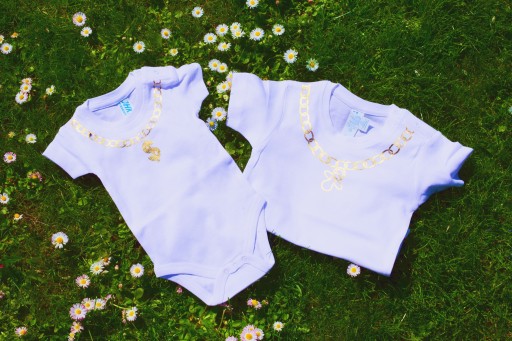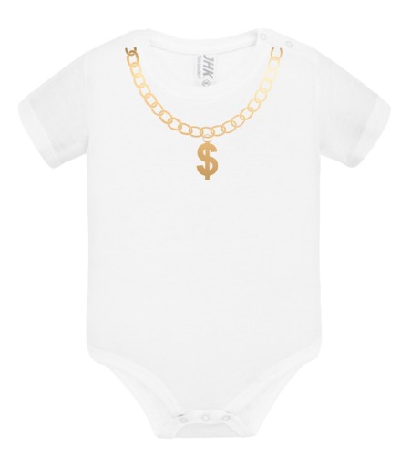 Body niemowlęcego wykonanego z najwyższej jakości, 100% bawełny. Bodziak jest ozdobiony nadrukiem złotego łańcucha z wisiorem w kształcie dolara. Nadruk został wykonany przy użyciu folii flex w kolorze złotym, który zapewnia metaliczny, błyszczący efekt.