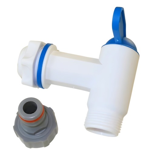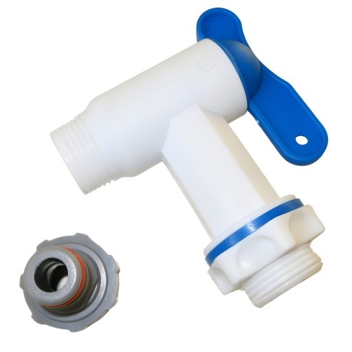Plastikowy kranik w kolorze białym z gwintem zewnętrznym 3/4" (26 mm) z uszczelką oraz nakrętką.