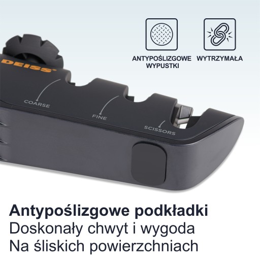 Prosta i intuicyjna ostrzałka do noży Deiss została zbudowana z myślą o codziennym użytkowaniu i sprawdza się doskonale w każdej sytuacji.