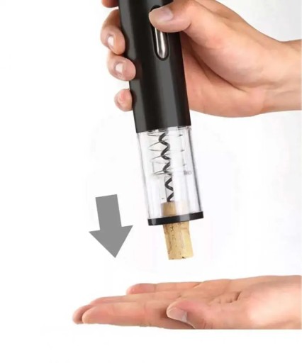 - Elektryczny korkociąg wyciąga korek z butelki po naciśnięciu przycisku.