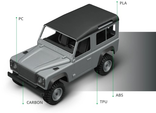 Bambu Lab X1 Carbon, wyposażony w dodatkowe chłodzenie i utwardzoną dyszę oraz nawęglany napęd, odblokowuje szerszy wybór materiałów, w tym PA, PC, PET i TPU, i specjalizuje się w polimerach wzmocnionych włóknem węglowym i szklanym.