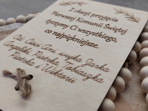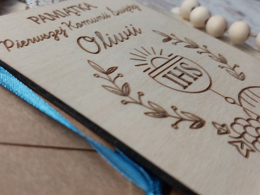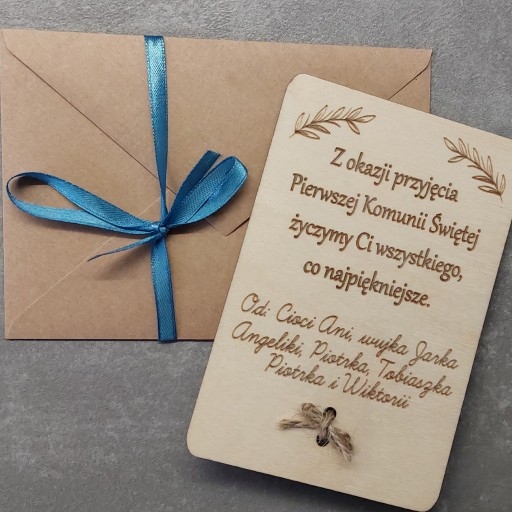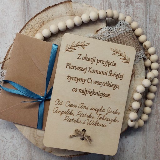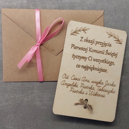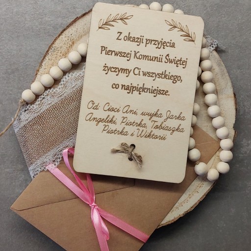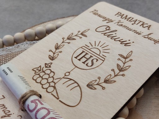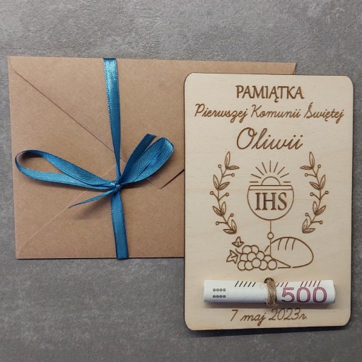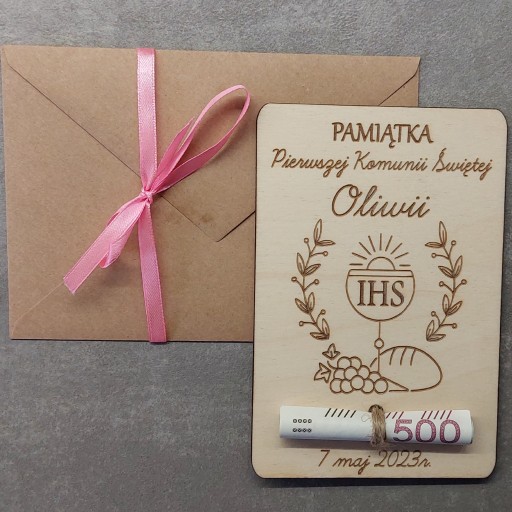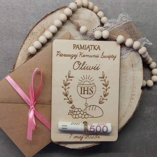 DREWNIANA KARTKA - PAMIĄTKA I KOMUNII ŚWIĘTEJ, PREZENT NA KOMUNIĘ Z MIEJSCEM NA BANKNOT (PERSONALIZACJA)