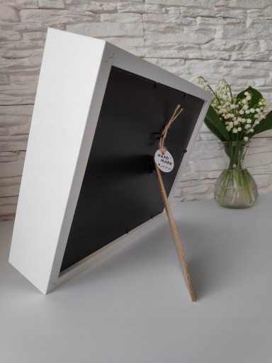 Ramkę można postawić na meblu lub powiesić na ścianie. Z tyłu ramki znajduje się wieszaczek i nóżka do oparcia. Z przodu znajduje się przeźroczysta plexa.