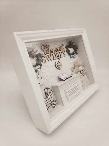 Biała ramka 3D z frezowanymi bokami, co dodaje uroku i elegancji. Znakomity prezent upamiętniający ten ważny moment w życiu ! Można go ofiarować dziecku, ale też podarować rodzicom chrzestnym lub innym ważnym gościom.