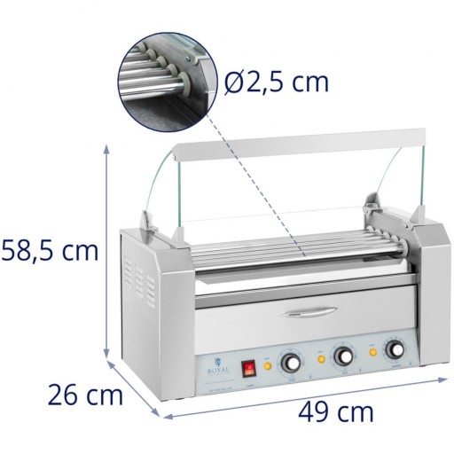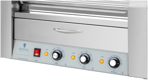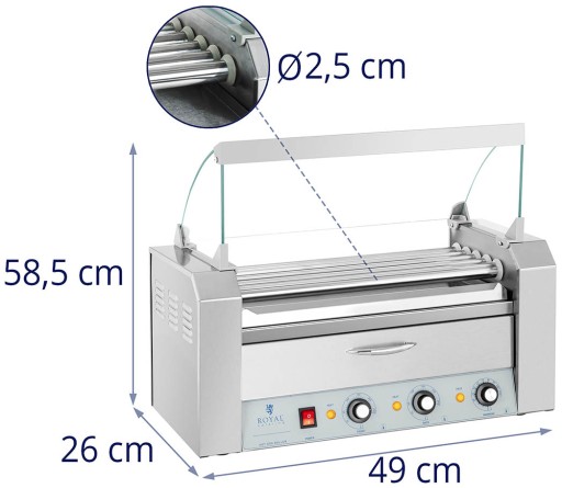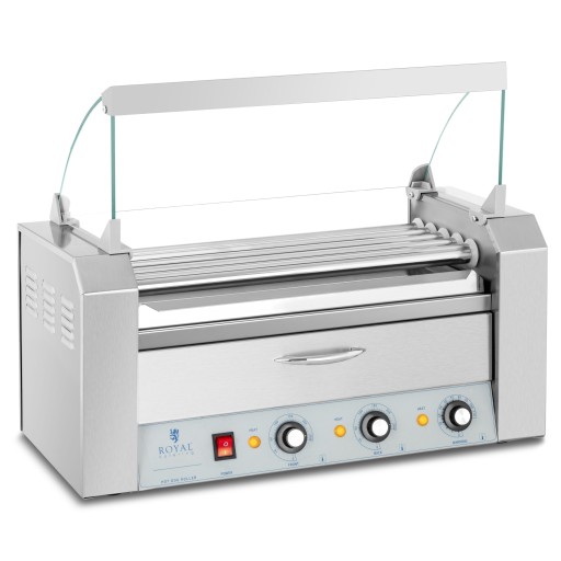 Grill rolkowy marki Royal Catering sprawdzi się w barach, bufetach, stacjach benzynowych czy na imprezach plenerowych. Pozwala przygotować jednocześnie 8 parówek do hot-dogów, frankfurterek, kabanosów czy kiełbasek do tortilli. Równomierne obroty o 360 sprawiają, że wędlina będzie jednakowo zarumieniona z każdej strony. Wytopiony tłuszcz zbiera się w tacy, którą łatwo wyjąć i umyć. Szuflada grzewcza zapewnia podgrzanie bułek w temperaturze od 30 do 110C. Dwie strefy grzewcze umożliwiają niezależne ustawienie temperatury. Parówki mogą się grillować lub być tylko podgrzewane. Temperatura jest regulowana jest w zakresie 30-250C. Pokrywa z hartowanego szkła chroni żywność przed zanieczyszczeniami i pozwala przyrządzać kiełbaski na oczach klientów.