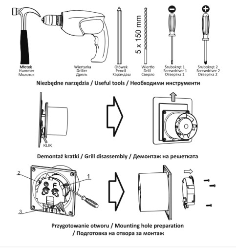 Wentylator składa się z korpusu (wirnik + silnik wentylatora) oraz zewnętrznego panela który nasuwa się na korpus.