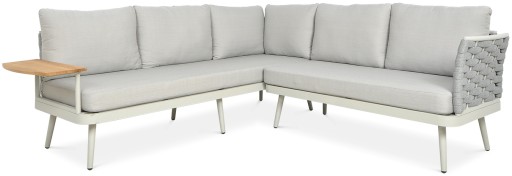 Komplet funkcjonalnych mebli ogrodowych najwyższej jakości, aluminiowy narożnik Reno Light Grey składa się z dwóch sof: 2-osobowej i 3-osobowej. Mogą tworzyć jedną całość, a równie dobrze można z nich korzystać osobno. W zestawie z narożnikiem Reno znajdują się jeszcze dwa okrągłe stoliki kawowe, każdy o nieco innych wymiarach. Narożnik Reno posiada stabilną, mocną konstrukcję z malowanego proszkowo aluminium, jednolity stelaż utrzymany jest w modnym, jasnoszarym kolorze. Sofy w narożniku ogrodowym Reno różnią się bokami, z możliwością przełożenia ich na dowolną sofę: w jednym jest to podręczna półeczka, wykonana ze starannie dobranego drewna tekowego, tak samo jak blaty w stolikach kawowych. W drugim boku widoczny jest oplot ze sznura poliestrowego, który także wypełnia przestrzeń pomiędzy oparciami sofy. W komplecie znajdują się również grube i wygodne poduchy, przeznaczone na siedziska i oparcia. Idealnie wpasowują się w kolorystykę całego zestawu wypoczynkowego. Meble ogrodowe z aluminium charakteryzują się wysokim poziomem trwałości oraz długowiecznością. Nie inaczej jest w przypadku narożnika Reno Light Grey - łatwo utrzymać go w idealnym stanie, nie potrzeba do tego specjalistycznych środków konserwujących. Powyższy komplet mebli wypoczynkowych nadaje się zarówno do domu, jak i zastosowań profesjonalnych. Narożnik Reno może stanąć wewnątrz pomieszczenia, a także w przestrzeni outdoorowej. Wszędzie będzie tak samo efektowny, komfortowy i przydatny.
