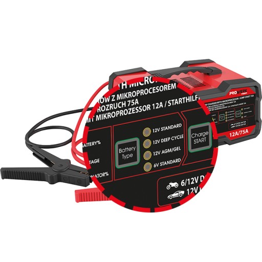 - Start: daje chwilowo 75 amperów, aby zmusić słabo naładowany lub wyczerpany akumulator 12 V do uruchomienia silnika