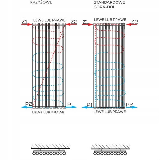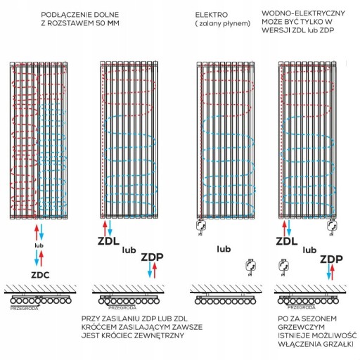 W tym przypadku należy pamiętać, że nie ma możliwości wykonania grzejnika z zasilaniem dolnym centralnym o rozstawie 50 mm z racji przegrody, która uniemożliwi obieg wody w grzejniku. Kolektor pod grzałkę powinien być po przeciwnej stronie niż zasilanie.