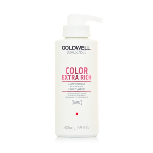 Goldwell Dualsenses Color Extra Rich 60 sec Treatment to maska do włosów grubych, naturalnych i farbowanych. Opóźnia proces wypłukiwania się koloru, zapobiega jego blaknięciu i matowieniu, dzięki czemu znacznie przedłuża efekty koloryzacji. Co więcej, dodaje włosom spektakularnego blasku, wygładza je i zmiękcza. A wszystko to w zaledwie 60 sekund.