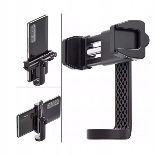 Uchwyt pozwalający na mocowanie telefonu na statywach i kijkach selfie. Pozwala on obracać telefon o 360 stopni dzięki czemu można wygodnie nagrywać w pionie i w poziomie. Dodatkowe mocowanie zimna stopka pozwala na dołożenie mikrofonu, lampy czy innych akcesoriów.