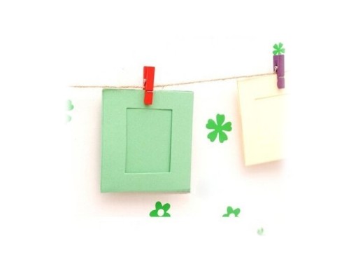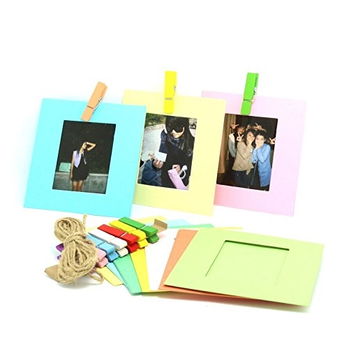 Zestaw 10 kolorowych ramek do zdjęć natychmiastowyc z magnesami oraz klamerkami i sznurkiem. Długość sznurka 220 cm.