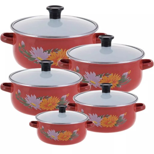 - Komplet garnków wykonanych z wysokiej jakości stali węglowej, pokrytej powłoką emaliowaną.