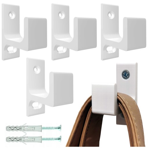 Oferujemy na sprzedaż 4 wieszaki na torebki. Wieszaki sprawdzają się bardzo dobrze. Pozwalają na powieszenie torebki, większość pasków dobrze mieści się w uchwycie (szerokość paska do 33 mm). Można zamontować na ścianie (dołączone śruby/kołki srebrne) lub elemencie drewnianym (np w szafie - dobór śrub w zakresie montującego)