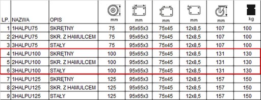 Zestaw składa się z czterech kółek wyposażonych w mocowanie na płytkę. W skład zestawu wchodzą dwa zestawy stałe o kodzie 3HALPU100K2 (poz.6 w tabeli), jedno koło skrętne z hamulcem o kodzie 2HALPU100K2 (poz. 5 w tabeli) oraz jedno koło skrętne o kodzie 1HALPU100K2 (poz. 4 w tabeli).