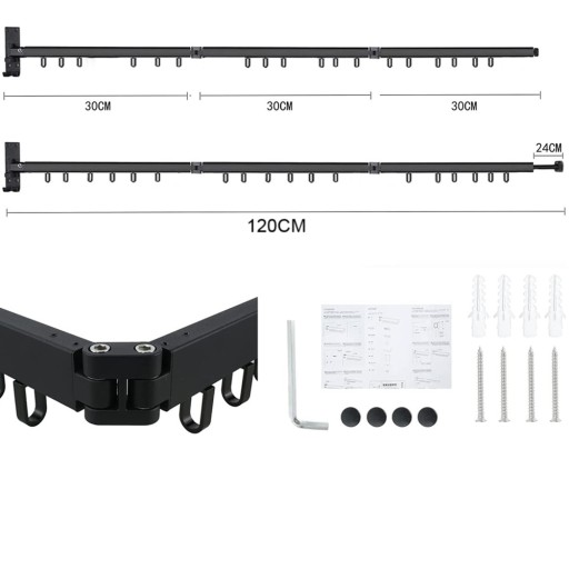 - 📝Wymiary: 3 złożone sekcje po 30cm każda, drążek przedłużający na końcu wieszaka rozciąga się 24cm, długość całkowita 120cm