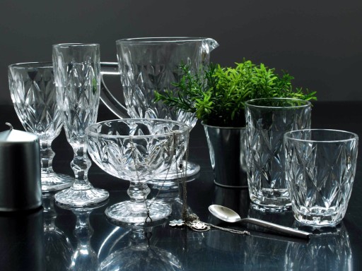 - Szklanki z grubego, przezroczystego, tłoczonego szkła