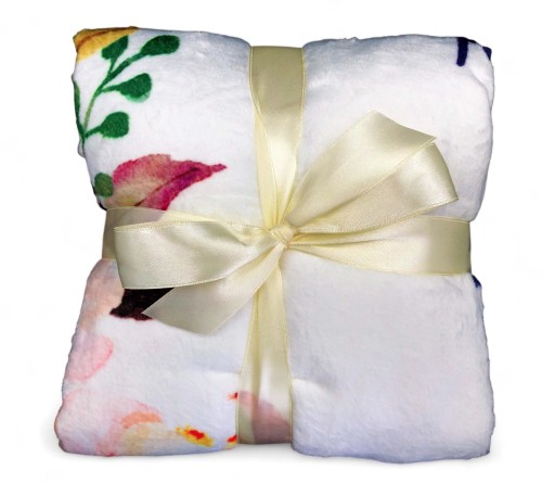 Kocyk jest w eleganckim celofanie i przewiązanej satynowej tasiemką. Idealnie sprawdziło się jako prezent dla rodziców.