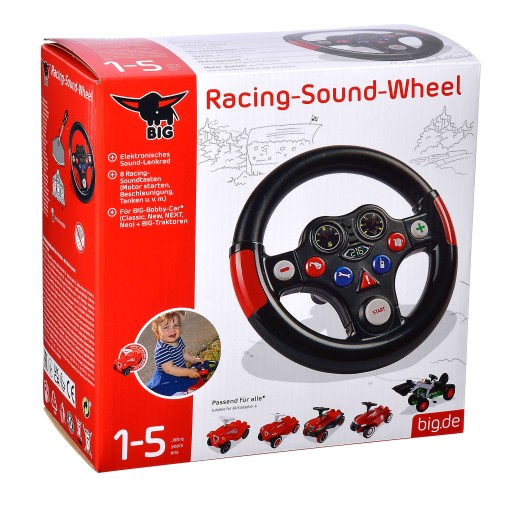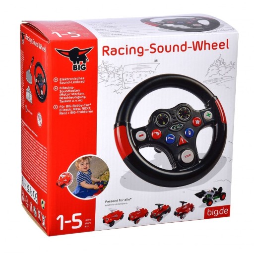 Kierownica Racing Sound Wheel renomowanej marki BIG to wspaniałe uzupełnienie jazdy jeździkiem. Kierownica posiada 8 przycisków oraz wydaje charakterystyczne dźwięki. Szybko tankuj auto, załóż odpowiednie opony i ruszaj w drogę!