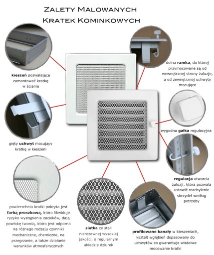 Dzięki malowaniu kratki metodą proszkową staje się ona odporna na uszkodzenia mechaniczne i działanie podwyższonej temperatury, a jej kolor pozostaje trwały i niezmienny.