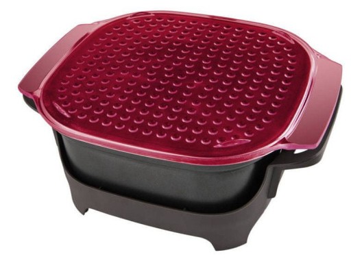 To praktyczne urządzenie posiada nieprzywierającą powłokę (teflon) oraz kwadratowy kształt. Pokrywa z wykończeniem ze stali nierdzewnej posiada otwory wentylacyjne oraz szklane okienko. Nie musisz już podnosić całej pokrywy aby zobaczyć na jakim etapie jest Twoja potrawa, wystarczy zajrzeć przez szybę! Bezpieczeństwo w użytkowaniu zapewnia specjalna blokada, która wyłącza urządzenie w chwili zdejmowania z niego pokrywy (nawet w wypadku włączonego przycisku na pokrywie! ). Zarówno stabilny stojak oraz uchwyty są izolowane – dzięki czemu bez problemu przeniesiesz oraz postawisz gorące danie gdzie chcesz (bez przekładania potrawy do innego naczynia)! Kolejnym praktycznym elementem jest długi przewód zasilający (1,5 m).