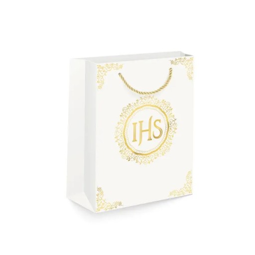 Torebka na prezenty z okazji Komunii Świętej IHS biało-złota to eleganckie opakowanie na prezenty. Połyskująca złotem grafika oraz uchwyty wykonane ze złotego sznureczka prezentują się bardzo uroczyście na tle przytłumionej bieli. Torebka występuje w 4 wzorach, a podczas składania zamówienia należy wybrać preferowany wzór, w przeciwnym wypadku zostanie wysłany losowy. Torebka ma szerokość 15 cm, wysokość 20 cm i głębokość 10 cm, co sprawia, że jest idealnym rozmiarem do opakowania drobnych prezentów z okazji Komunii Świętej.