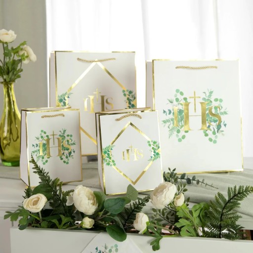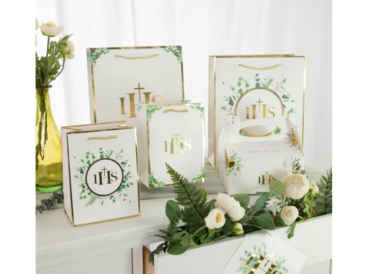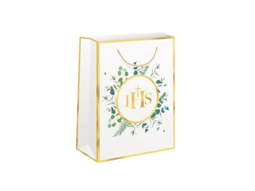 Torebka na prezenty komunijne IHS Eukaliptus to idealne rozwiązanie, jeśli szukasz efektownego opakowania dla podarunków z okazji Pierwszej Komunii Świętej. Torebka wyróżnia się subtelnymi, zielonymi gałązkami eukaliptusa, które nadają jej wiosennego charakteru. Delikatnie połyskujący napis IHS oraz pozostałe ornamenty w tradycyjnym złotym kolorze, dodają elegancji i podkreślają wyjątkowość tego ważnego wydarzenia.