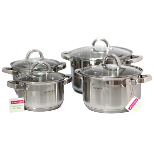 Komplet garnków Kamille wykonany z jakościowej stali nierdzewnej, posiada 5-warstwowe indukcyjne dno, które umożliwia szybkie i równomierne nagrzanie, co pozwala na proste przygotowania ulubionych potraw.