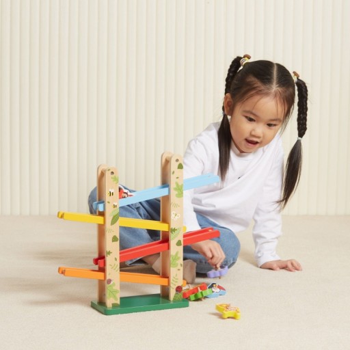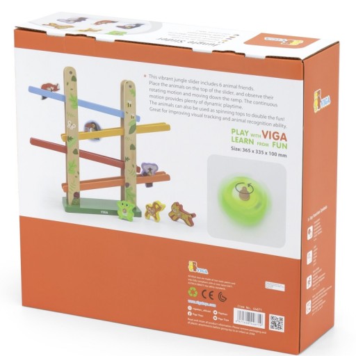 Ta kolorowa zjeżdżalnia od marki VIGA zawiera 6 słodkich zwierzątek prosto z dżungli. Połóż zwierzątka na samej górze i obserwuj jak kręcąc się zjeżdżają na sam dół rampy. Ciągły ruch dostarcza mnóstwo zabawy. Zwierzątka mogą być również wykorzystane do kręcenia ich pionowo jak bączki. Korzystając z tego produktu zabawa rozwinie umiejętność rozpoznawania zwierząt i śledzenia wzrokowego.