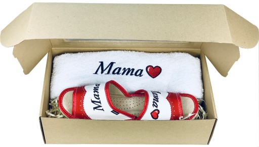 W skład zestawu wchodzi: ręcznik 50x100 cm - z haftem Mama oraz skórzane kapcie z haftem "MAMA". Zestaw zapakowany jest w karton z okienkiem.