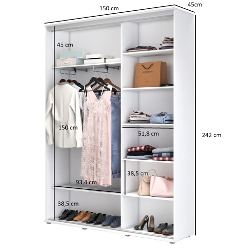 Szafa LORIS została zaprojektowana tak aby wpasować się w każde pomieszczenie oraz zapełnić przestrzeń praktycznie od podłogi do sufitu, co w dzisiejszych czasach przy coraz mniejszym metrażu domów i mieszkań jest jej bardzo wielka zaletą.