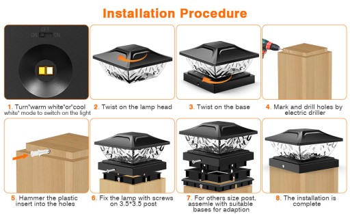 【ODPOWIEDNI ROZMIAR I ŁATWA INSTALACJA】: Nasze lampy solarne na słupki ogrodzeniowe są dostarczane z różnymi rozmiarami podstaw, które są kompatybilne z dowolnymi standardowymi drewnianymi słupkami 3,5x3,5, 4x4, 4,5x4,5, 5x5 lub winylowymi kołpakami. Szybka instalacja latarni słonecznych na pokładzie bez okablowania. Po prostu zamontuj latarnię solarną za pomocą dołączonych śrub montażowych na słupku ogrodzenia.