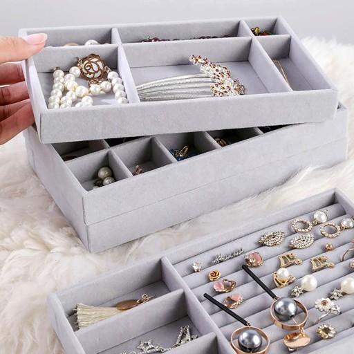 Organizer na tacę na biżuterię, zestaw 8 pojemników na biżuterię do układania w stos na pierścionki Kolczyki Naszyjnik Bransoletki Zdejmowany przegroda Wyświetlacz biuterii Pomysł na prezent Szary, 212 x 125 x 25mm